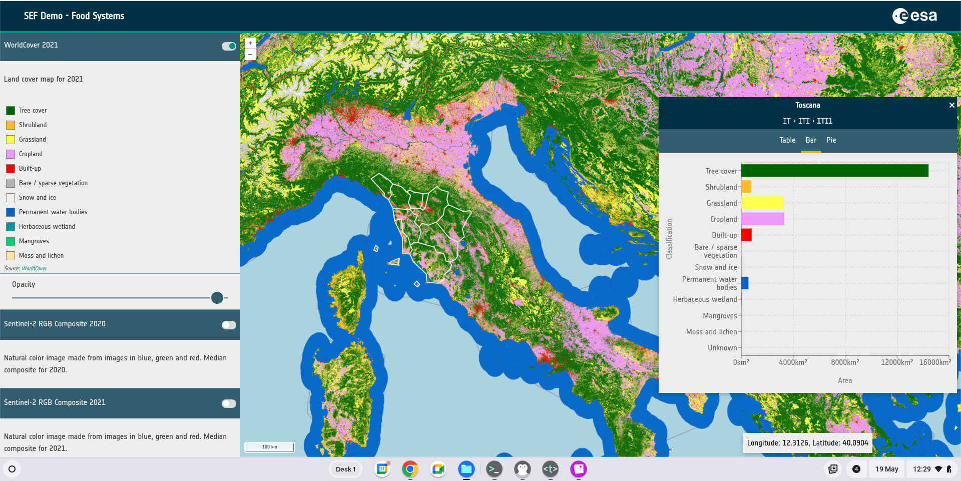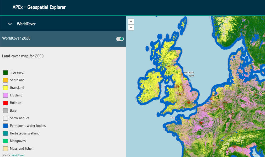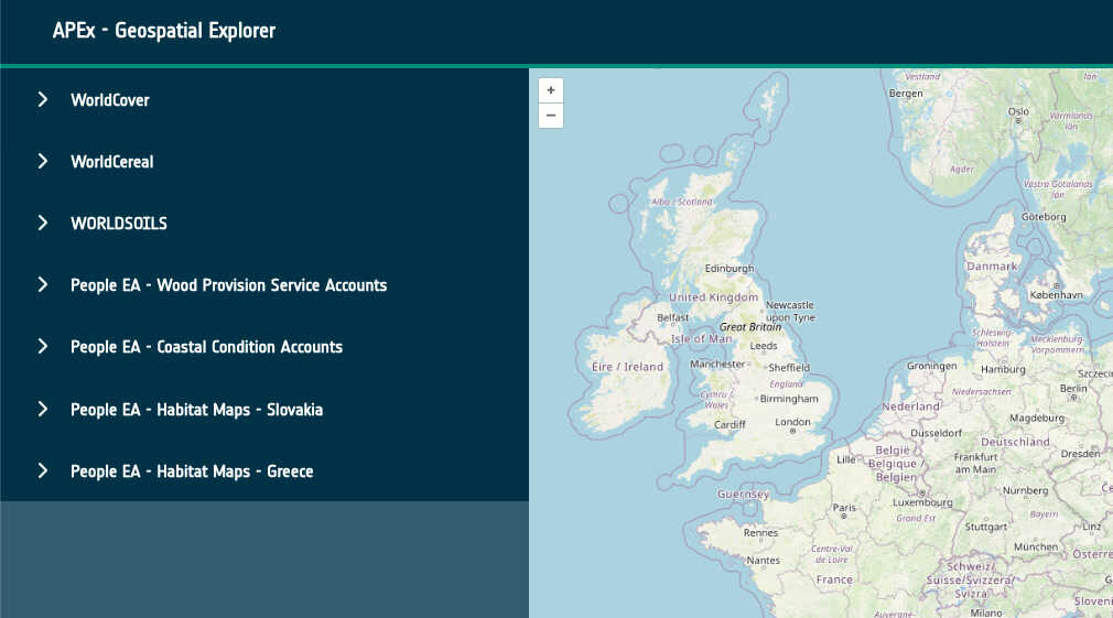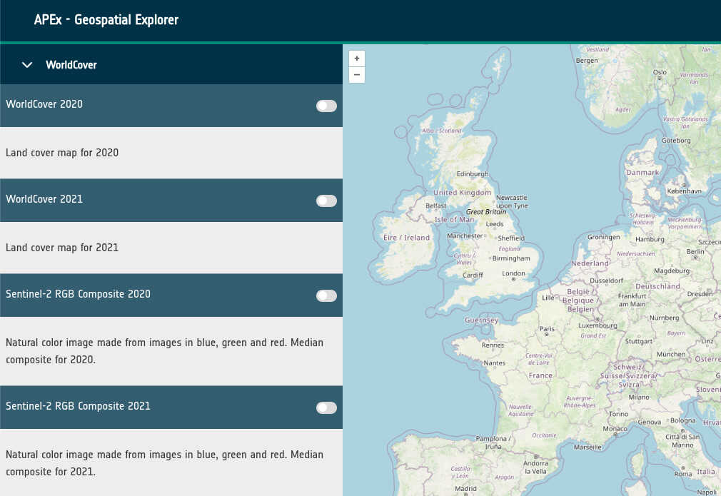 The APEx Geospatial Explorer is a web map application with a configurable user interface that can be used to showcase the results of ESA projects as interactive maps, tables and charts. This user guide provides some general user guidance for a number of supported features.