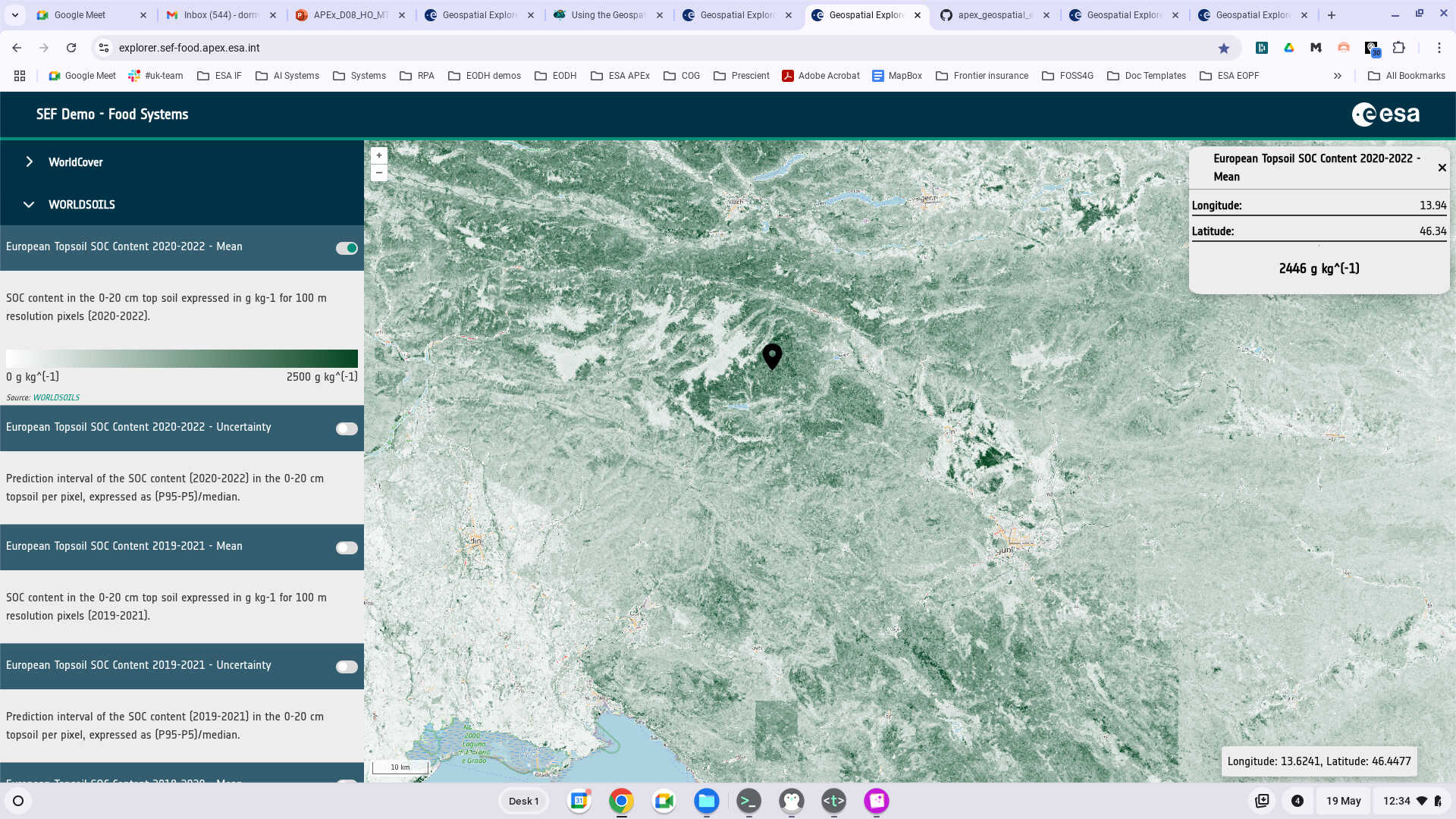 For some layers (such as the European Top Soil Layers in the SEF Food Demo) clicking on the map drops a marker and displays an “info” box of the latitude, longitude and data value at the marker location, allowing you to display the precise value of the data at that point.