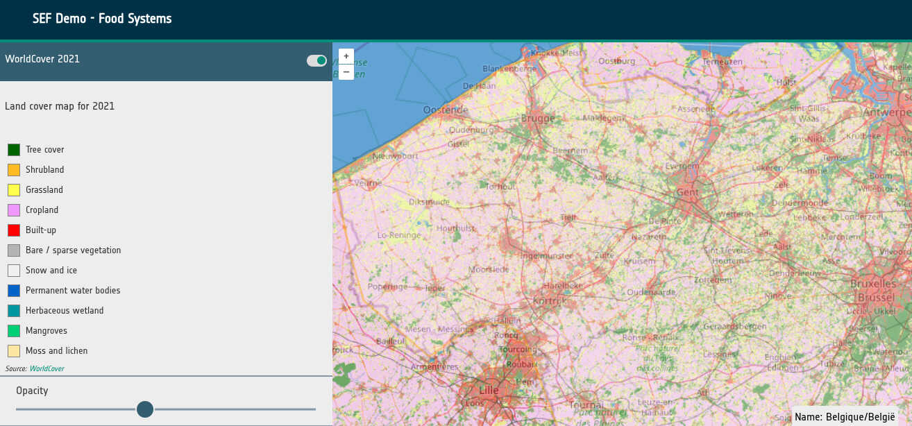 To add the data on to the map, use the toggle button. Once a layer is toggled on the layer panel will expand to show you more information about the layer - for example, a legend to help you interpret the map. If it has been configured you may also see an attribution link, which may link you out to a project page or metadata record about the layer. The example below has been linked to the World Cover website.