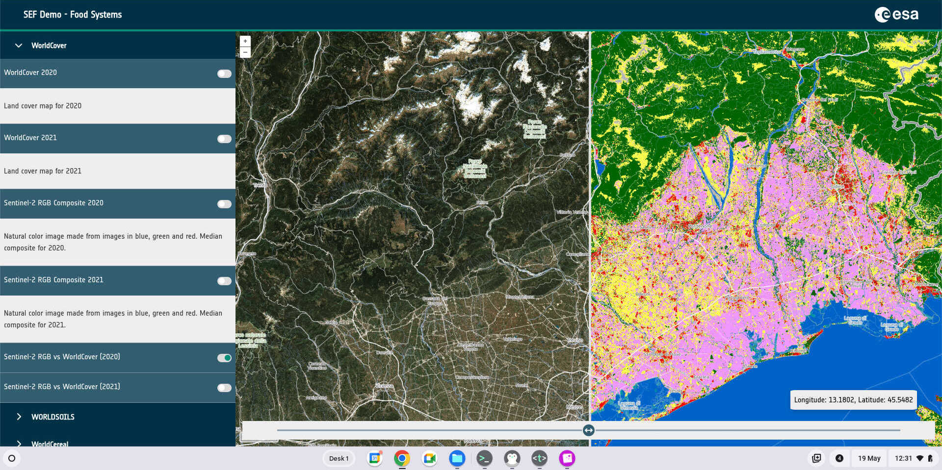 The Geospatial Explorer also allows different layers to be compared in a split screen view. In the current release of the explorer, these comparison layers are defined in the configuration for a given explorer, but in a future release it will be possible for you to choose your own pair of layers to view in a split screen mode. When you are in a split screen mode, the slider at the bottom of the map allows you to “swipe” from left to right to compare the two layers with one another.