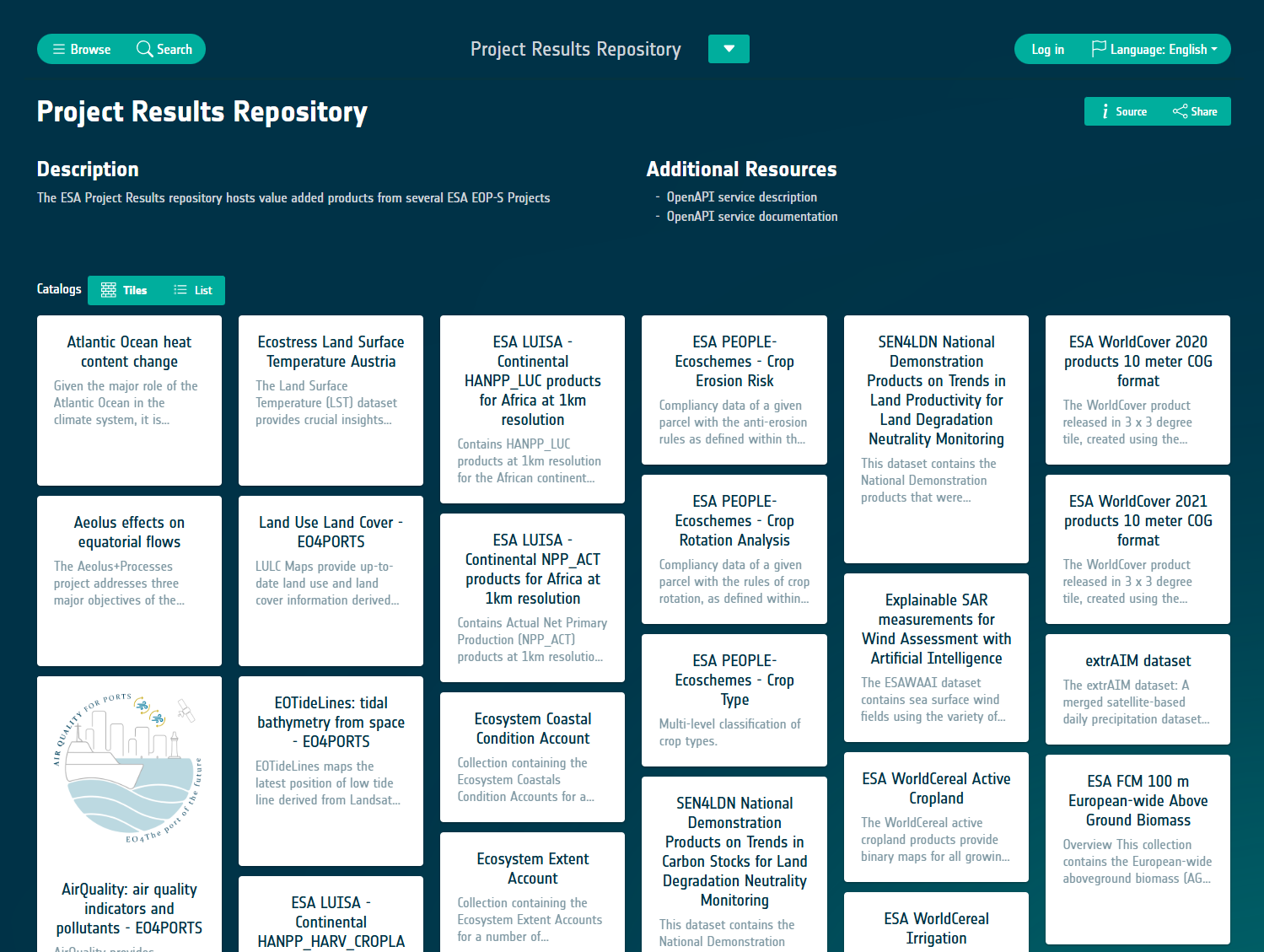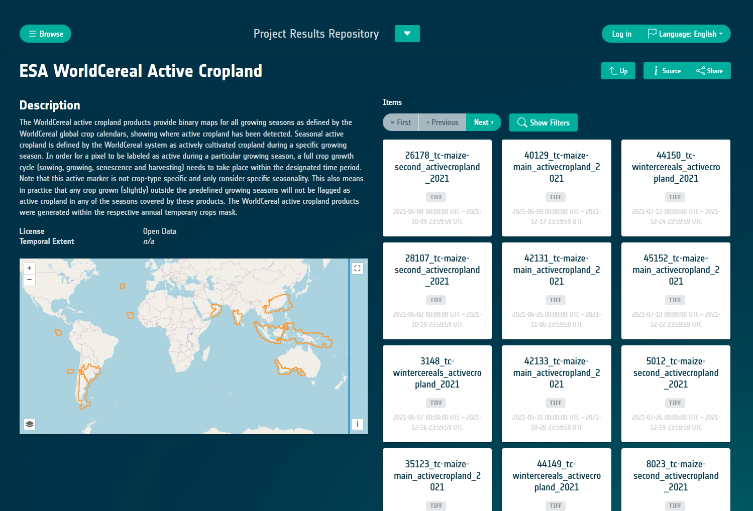The Product Catalogue enables projects to create their own SpatioTemporal Asset Catalogue (STAC), which serves as a comprehensive metadata collection for efficient organisation and discovery of geospatial data assets. This information is presented in a user-friendly JSON format.